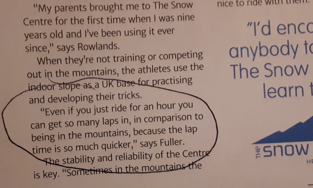 Another dubious quote that struck me was by Aimee Fuller in an ‘advertorial’ for The Snow Centre.
