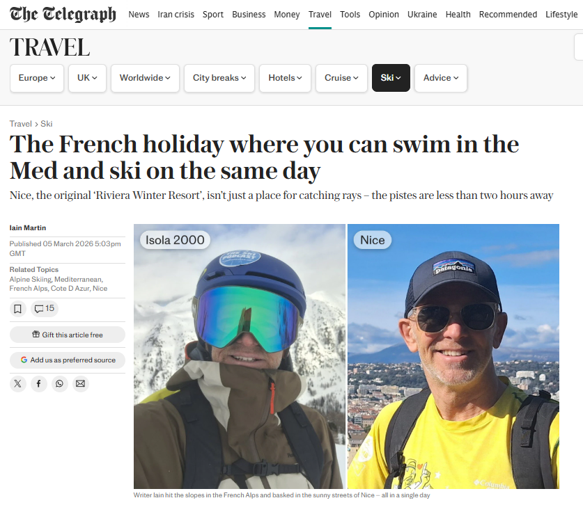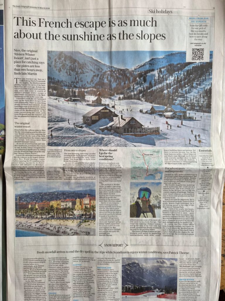 Iain combined a visit to Isola 2000 with a winter break in Nice in February 2026. His article on this trip has now been published by The Telegraph, online and in print in the Saturday newspaper.